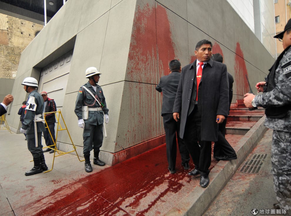 在首都拉巴斯(La Paz)的總統府,總統衛隊人員正在巡邏,剛才女權團體「女性創造」(Mujeres Creando)朝總統府丟擲紅色漆彈的痕跡還留在牆上,看了令人怵目驚心。