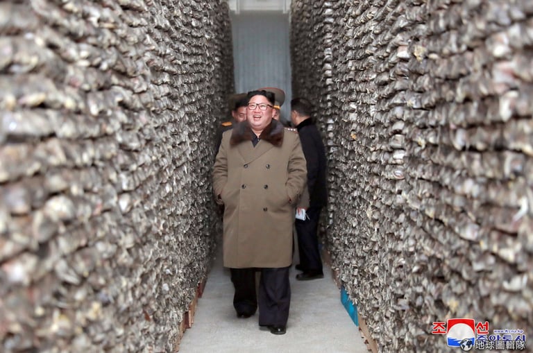 在這張朝鮮中央通訊社釋出的照片中,可以看到北韓領導人金正恩笑著走過一片片的真空包裝漁獲。
