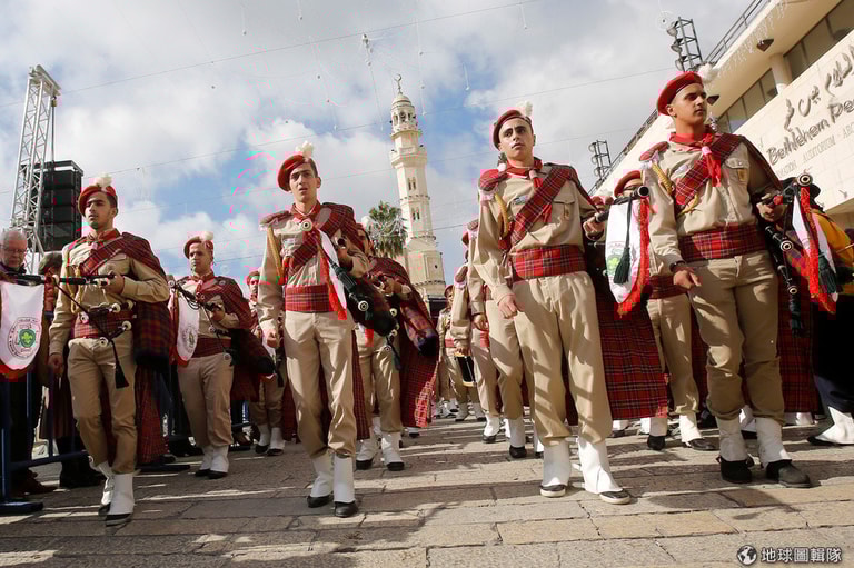在位於伯利恆馬槽廣場的聖誕教堂前,披上紅色格紋披風的軍隊正在威風凜凜的遊行。
