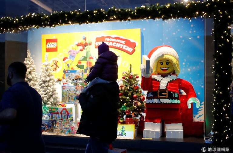 在蘇黎世街頭,民眾走過擺有聖誕主題的樂高玩具櫥窗。
