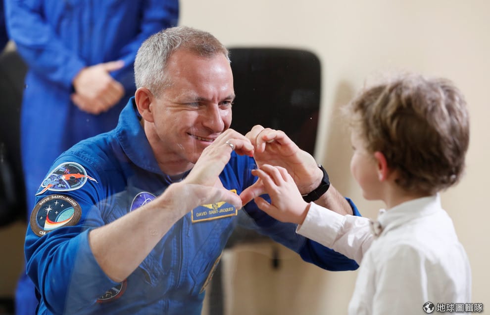準備前往國際太空站的加拿大太空人聖-雅克(David Saint-Jacques)隔著玻璃,對著兒子比出愛心手勢。