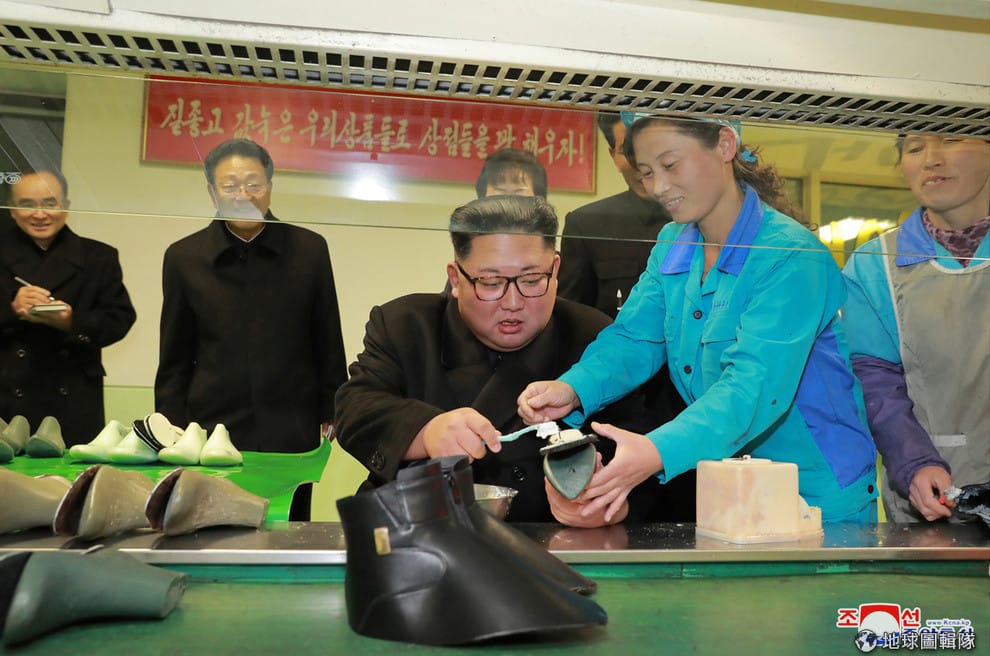 在這張朝鮮中央通訊社釋出的照片裡,北韓領導人金正恩在視察製鞋工廠時體驗製鞋過程。