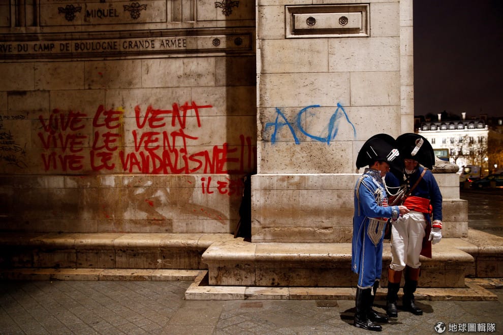 在巴黎著名地標凱旋門,兩名打扮成拿破崙時代軍人的民眾,站在遭到示威民眾塗鴉和破壞的基座旁。