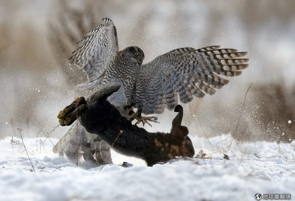 在哈薩克第一大城阿拉木圖(Almaty),一隻獵鷹在比賽中向下俯衝抓兔子,這一幕也被鏡頭捕捉了下來。