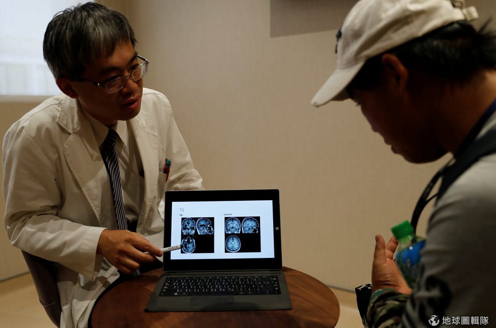 路透社 / 達志影像來到臺北榮民總醫院新竹分院,精神科主治醫師林明燈正在解釋陳宏智的腦部狀況。