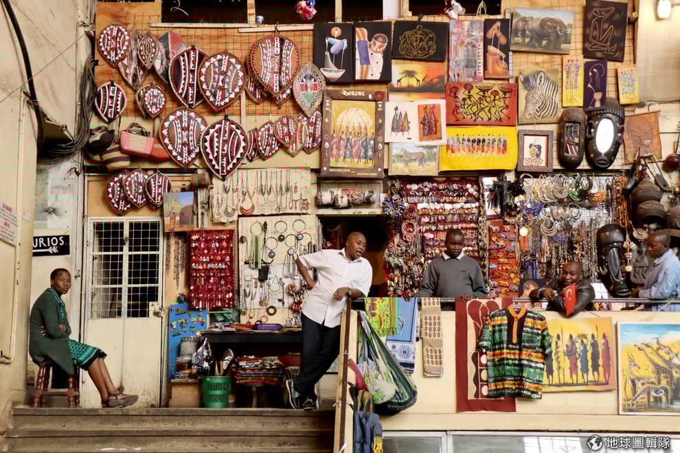 在首都奈洛比的紀念品店,店員們三三兩兩待在店外聊天,等待觀光客上門。