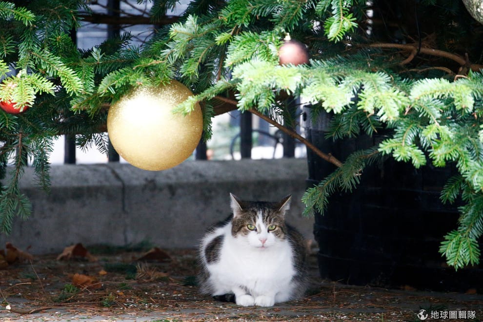 在倫敦唐寧街(Downing Street)十號的英國首相府,一隻貓坐在裝飾好的聖誕樹下,準備迎接聖誕節的到來。