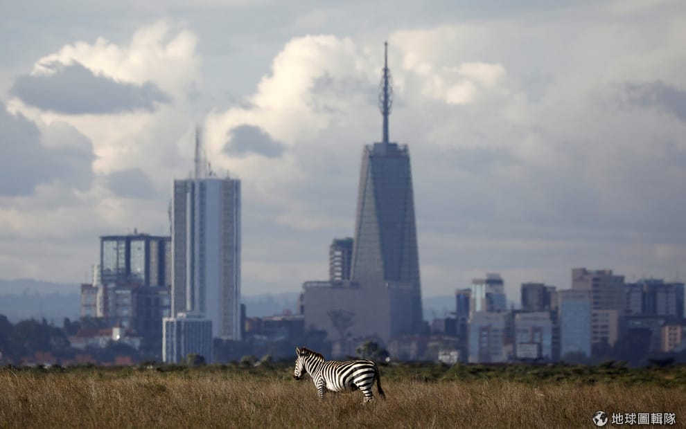 在奈洛比國家公園內,一隻斑馬的身後是拔地而起的高樓大廈,這座國家公園與奈洛比市區僅有柵欄相隔。除了斑馬,公園內還有非洲水牛、狒狒、黑犀牛、豹、獅子等野生動物。
