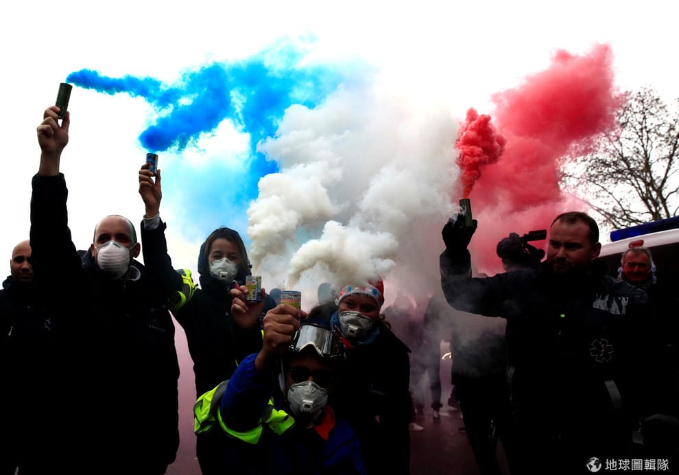 在巴黎協和廣場,穿著黃背心的救護車駕駛用煙霧彈噴出象徵法國國旗的藍、白、紅三色,抗議法國政府即將在明年調漲燃料稅的決定。
