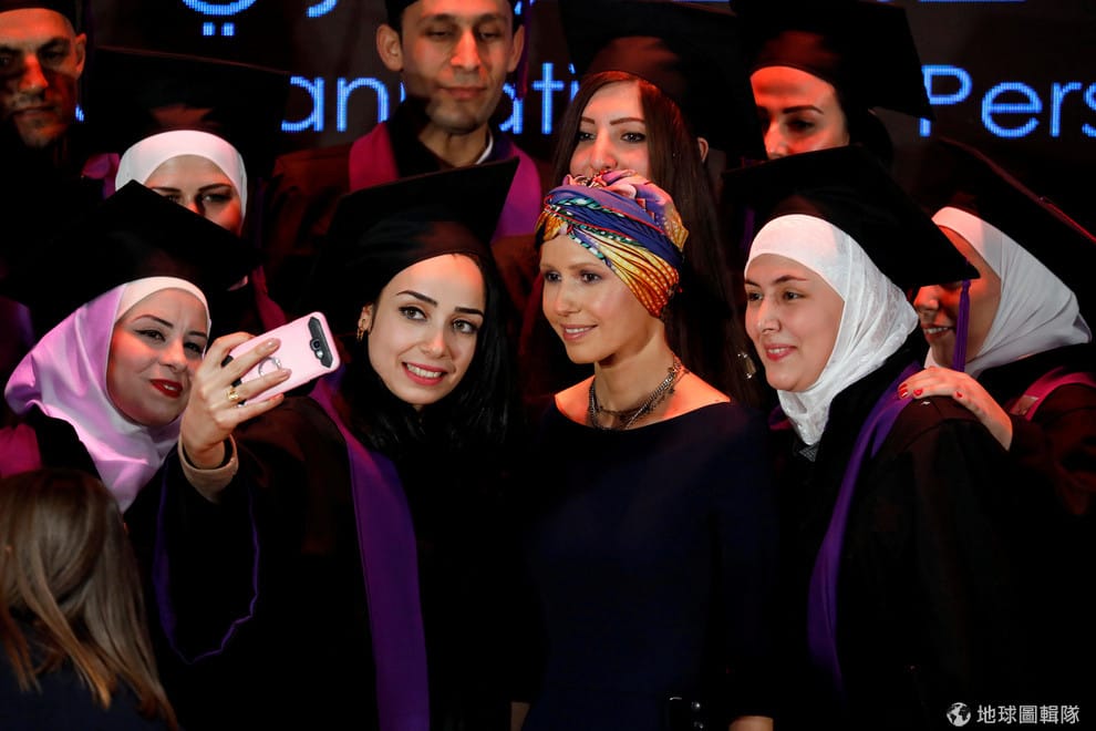 在大馬士革大學的畢業典禮上,敘利亞總統阿薩德(Bashar al-Assad)的妻子阿斯瑪(Asma al-Assad)現身會場,和畢業生一塊自拍,接下來她會進入敘利亞身心障礙者組織中工作。