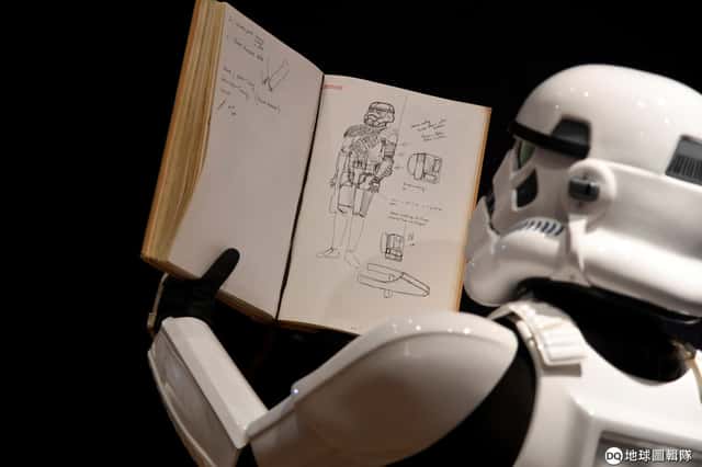 在倫敦邦瀚斯(Bonhams)拍賣行,一名打扮成帝國風暴兵的男子手上拿著《星際大戰》服裝設計師莫洛(John Mollo)的素描本,這本繪有《星際大戰》服裝的素描本準備被拍賣。