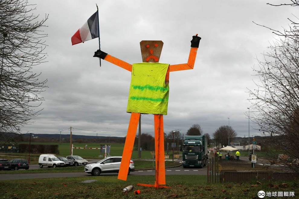 在巴黎西北邊的蓋隆(Gaillon),身穿黃背心抗議的民眾架起了人形立牌,並且封鎖了連接蓋隆和外頭的圓環,希望透過這場示威向政府表達訴求。