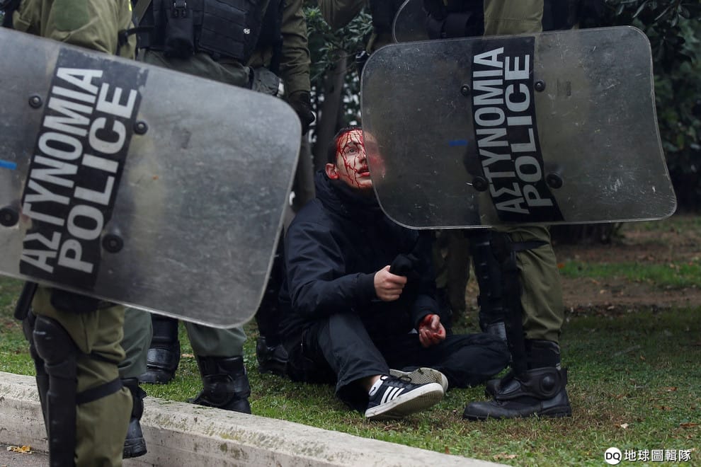 在首都雅典,一名抗議人士和鎮暴警察發生衝突頭破血流,他為了紀念在 2008年希臘動亂中遭警方擊斃的 15歲少年格里戈羅普洛斯(Alexandros Grigoropoulos),和其他示威民眾一起走上街頭。