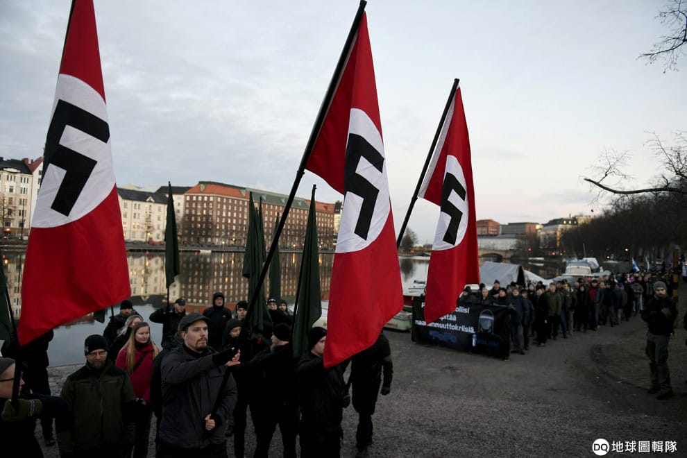 在首都赫爾辛基,芬蘭新納粹主義人士高舉納粹旗幟,參加新納粹獨立紀念日遊行。
