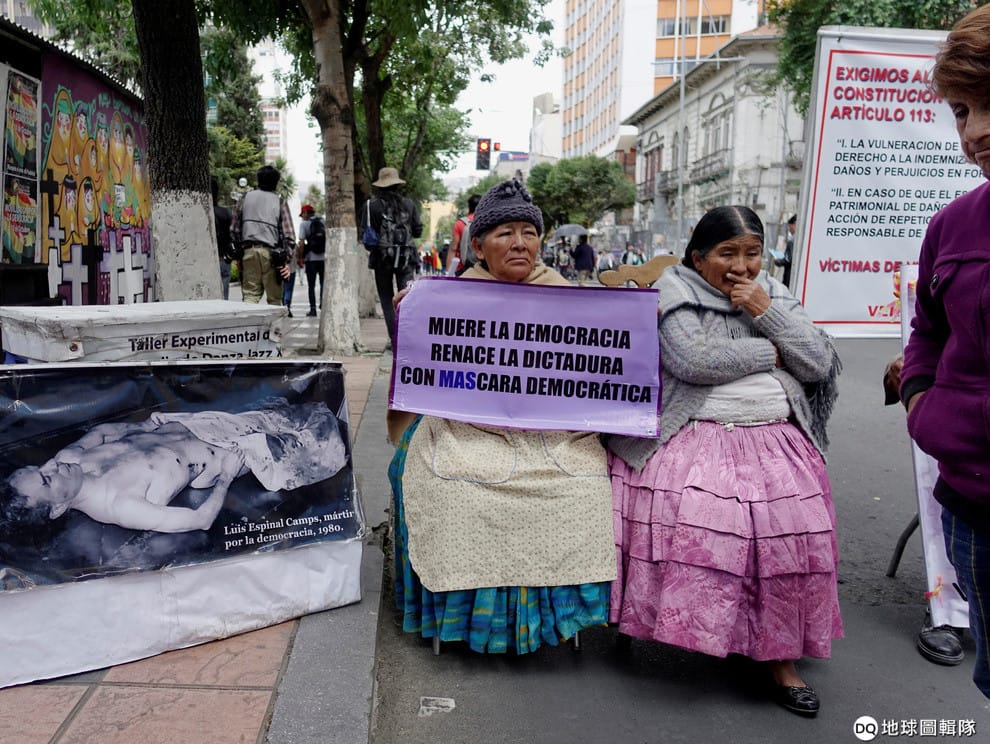 在首都拉巴斯,不滿玻利維亞總統莫拉萊斯(Evo Morales)想要再競選下一任總統的民眾上街抗議。其中,一名穿著傳統褶邊裙的女子手上舉著寫有「民主已死,獨裁戴著民主的面具重生」字樣的抗議海報。