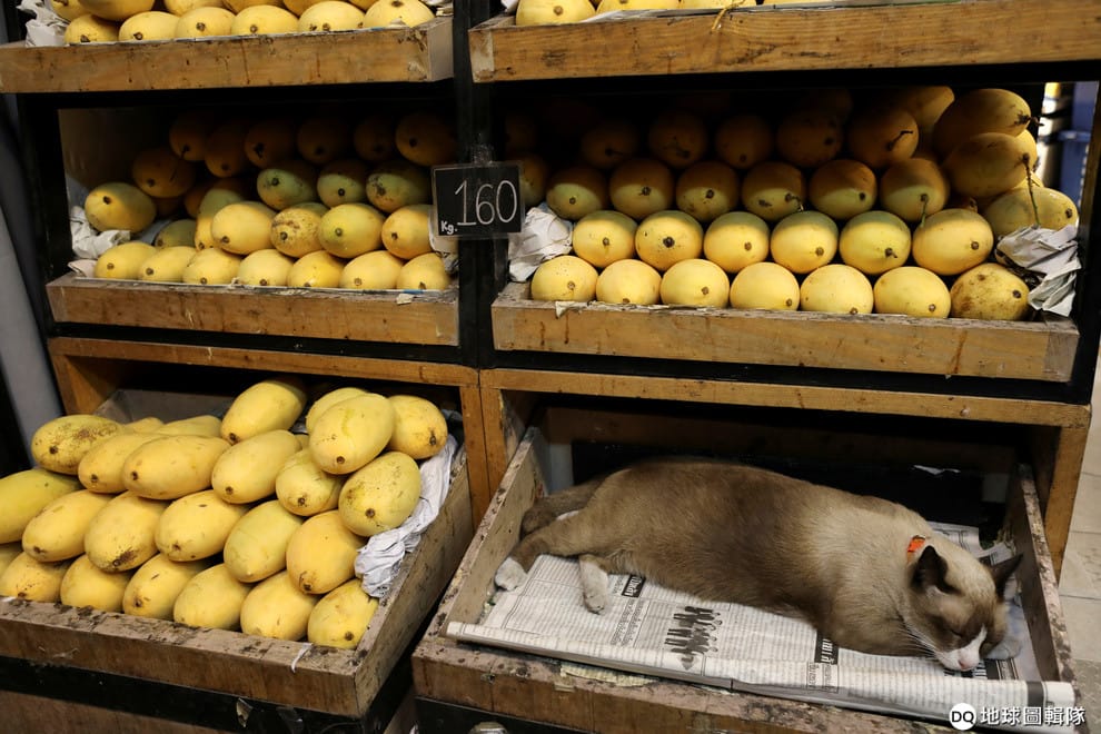 在曼谷一家芒果專賣店裡,一隻貓靜靜地躺在原本應該放芒果的木架上睡覺。