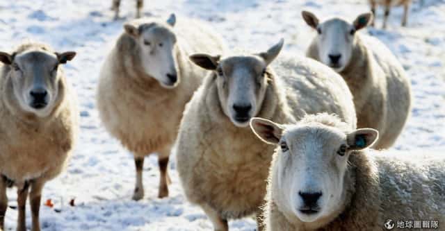 另一群英國羊咩咩,他們是屬於「黑臉」羊喔,黑色的頭在雪地中好顯眼!圖片來源:Christopher Furlong/Getty Images