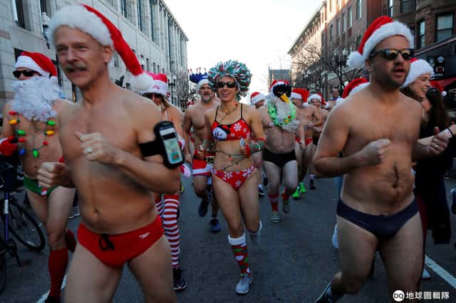 在波士頓街區後灣(Back Bay),來參加聖誕泳裝路跑(Santa Speedo Run)的人們剛剛從起跑線啟程。