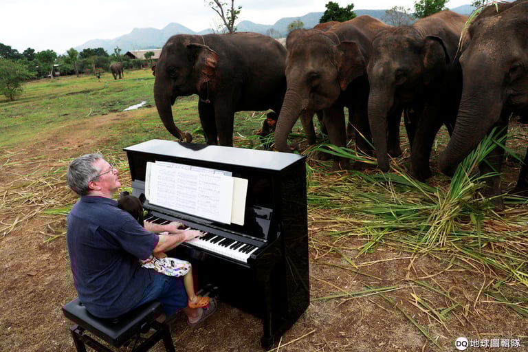 來到位於泰國北碧府(Kanchanaburi)的大象保護園區「大象世界」(Elephants World),這裡有超過 30隻大象因為伐木或觀光需求而受傷,或是因為年紀大了而居住於此。因此當今年 57歲的英國人巴頓(Paul Barton)在 2011年來到此處時,他決定要用鋼琴來替這些大象帶來不一樣的聽覺饗宴。