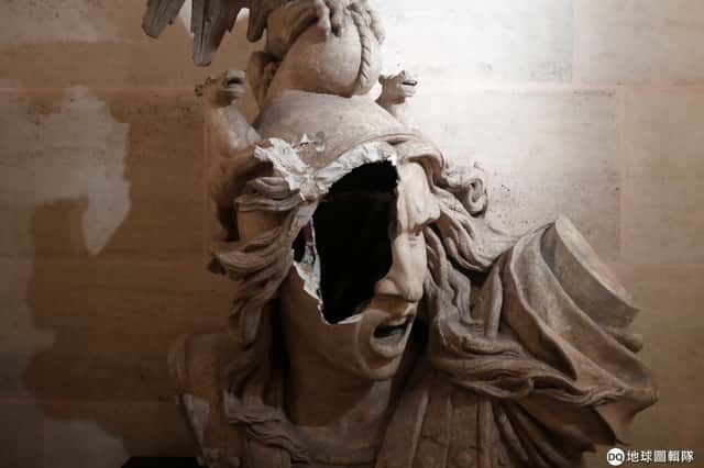 在巴黎凱旋門藝廊重新開放前夕,隔著玻璃帷幕,遭到破壞的裝飾品「自由精神」[Spirit of Liberty(1895)]被攝影師捕捉下來。