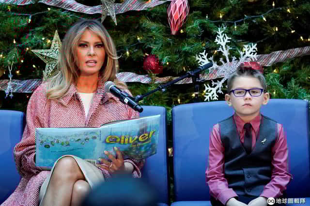 美國第一夫人梅蘭妮亞(Melania Trump)在拜訪完美國健保體系相關機構後,坐在 5歲男童西姆(Nathan Simm)旁朗誦兒童聖誕故事,西姆因為常在公眾螢幕談論肢體損傷議題,而在美國小有名氣。