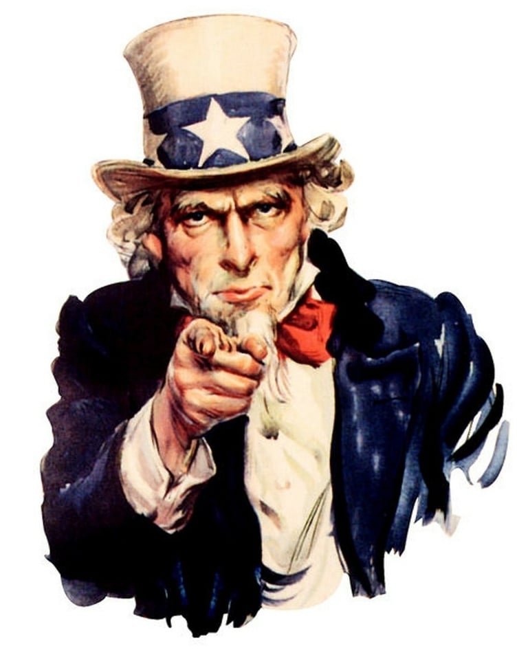 指「美國政府」。19 世紀美國爆發美英戰爭時,有位叫 Samuel Wilson 的肉販向美軍供應牛肉,而他的暱稱叫做 Uncle Sam,其縮寫剛好就指美國 (US),此後 Uncle Sam 便作為美國政府的代稱,而 Uncle Sam 是美國擬人化的形象,如圖這張常見的宣傳海報。