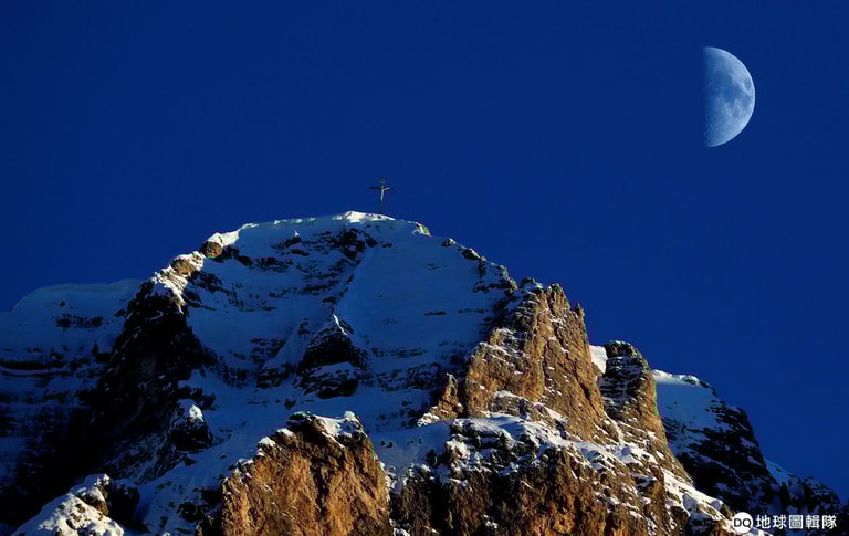 月亮緩緩升過多羅米提(Dolomites)山脈,構成一幅美麗的景致。