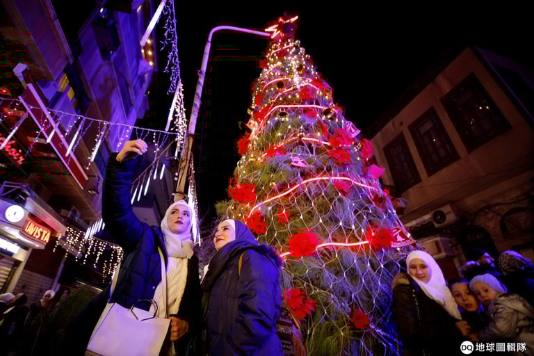 在首都大馬士革(Damascus),人們正在和街頭的聖誕樹一同自拍,享受佳節來臨的氛圍。