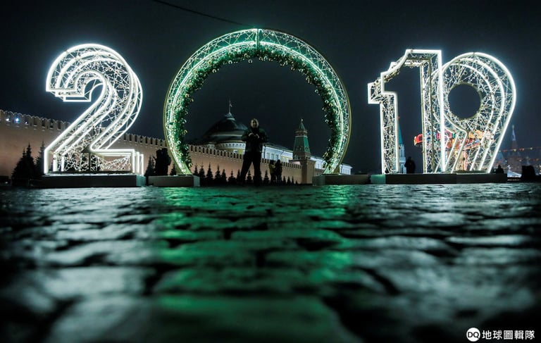 一座 2019年的燈光造景被擺放在首都莫斯科(Moscow)的紅場前,標誌著 2018年即將下台一鞠躬。