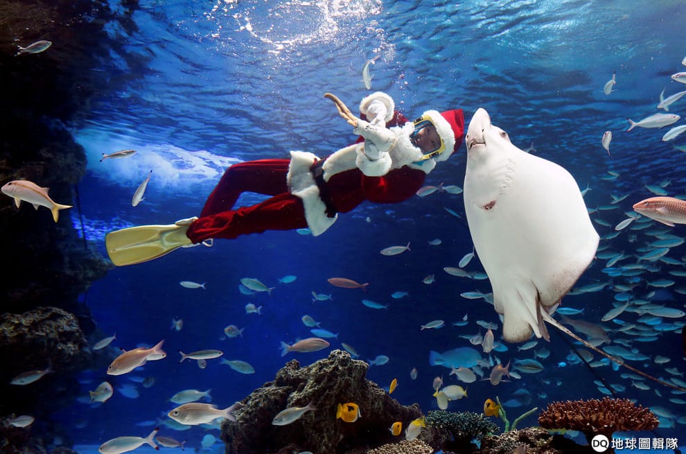 在東京陽光水族館,一名潛水者打扮成聖誕老人的模樣,和水中生物一同玩耍著。