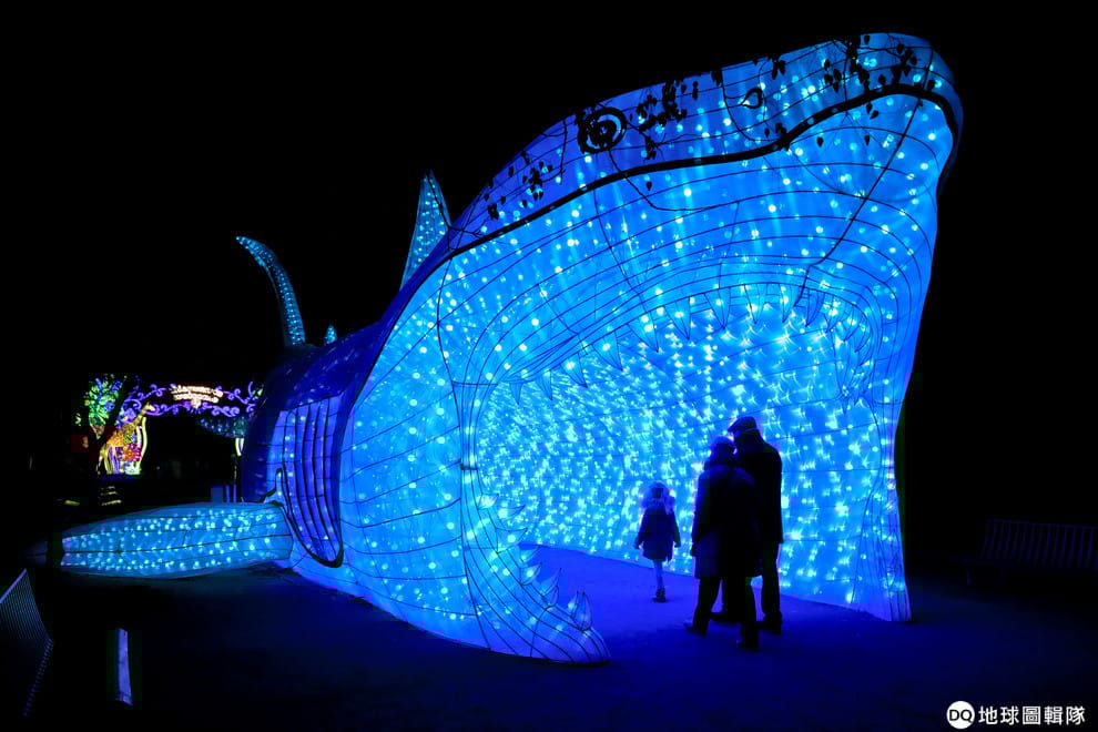 參觀者行走在巴黎植物園之間,欣賞著這裡以「照亮物種」(Shining a light on species)為主題的燈光藝術展。