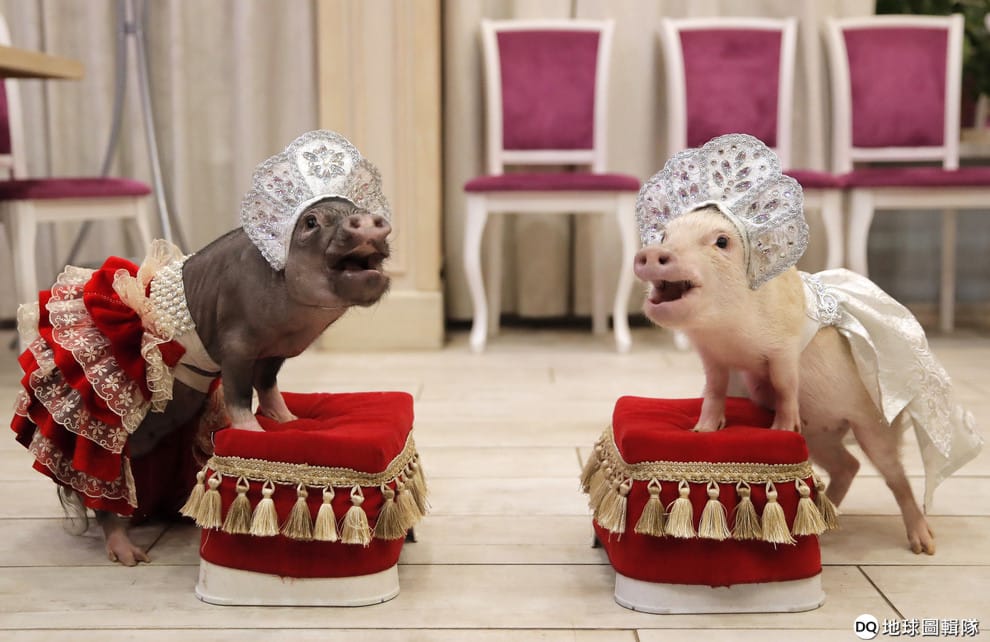 在城市巴拉希哈(Balashikha),被打扮成公主模樣的迷你豬正在小舞台上表演。
