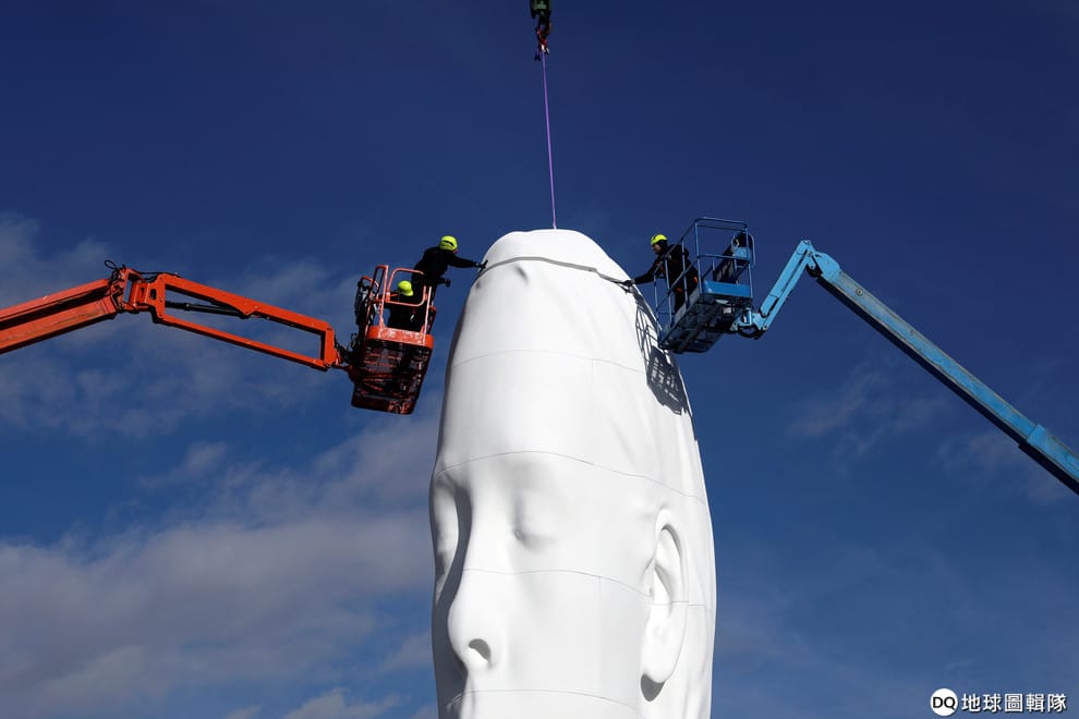 工人們正忙著幫西班牙雕塑家潘薩(Jaume Plensa)的雕塑品「茱莉亞」(Julia)進行最後妝點。這個看起來像被拍扁的頭像,是潘薩的經典作品之一。