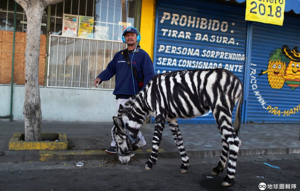 一名男子帶著被染色成斑馬的驢子,信步走在大街上。