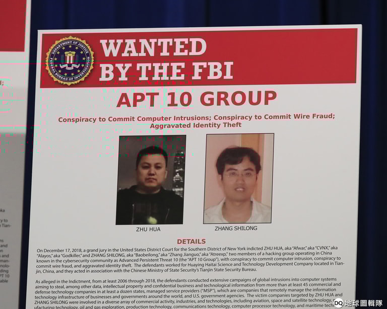 根據美國司法部提供的資料,遭到起訴的兩名中國駭客分別是朱華和張士龍,這兩人所屬的駭客團體名為「高級持續性威脅 10」(Advanced Persistent Threat 10),簡稱為APT 10。