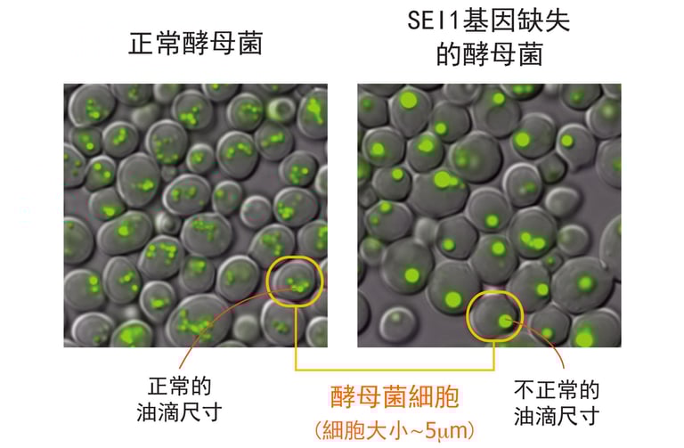 油滴只存在於人體的脂肪細胞嗎?非也。像是酵母菌這種單細胞,也擁有「油滴」。並且隨著基因變異,也會出現油滴大小和數量異常的情況,如下圖所示: