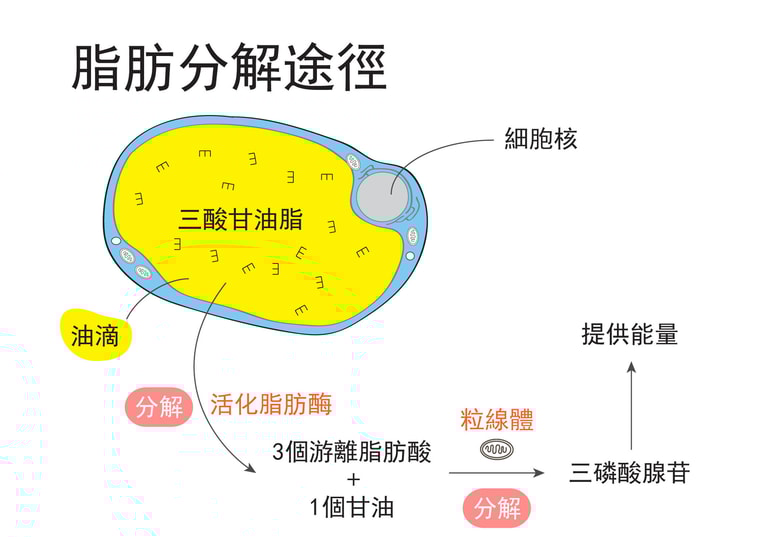 人體一段時間不進食,也不會立刻歸西,是因為身體有儲存能量的途徑:肝臟攝取消化完的食物來供應身體能量,多出來的部分則以「三酸甘油脂」儲存於脂肪細胞的「油滴」之中。
