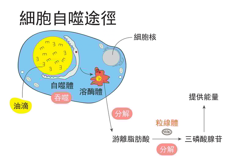 透過這機制,酵母菌得以在營養缺乏時,慢慢地用液胞把油滴吃掉,以延續生命。