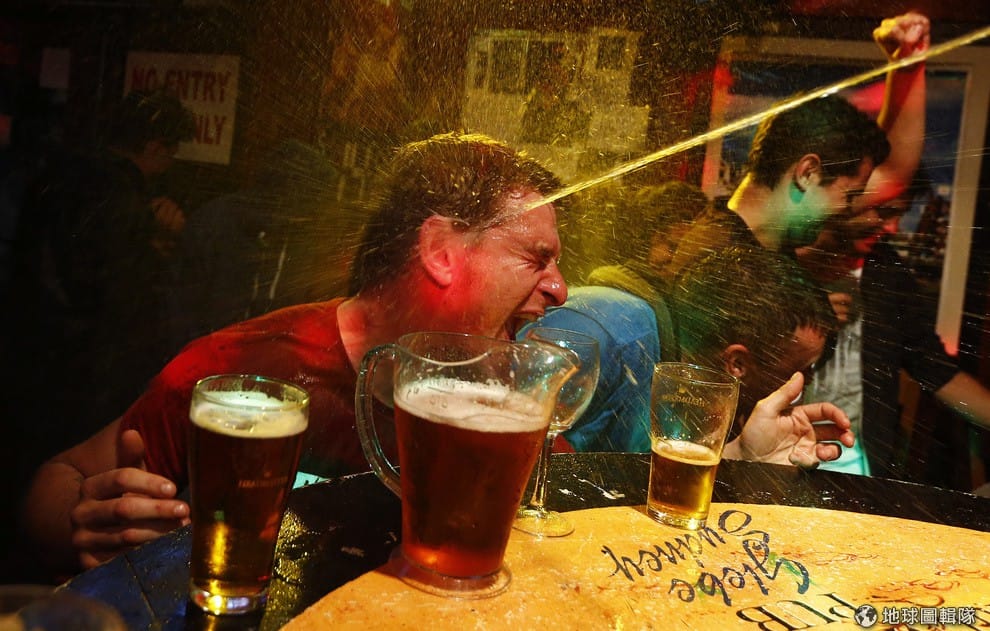 每次下注下對的贏家,可以得到免費啤酒和T恤當獎品,照片中的男子就是當晚的「賽蟹」贏家,他正接受啤酒水柱洗禮
