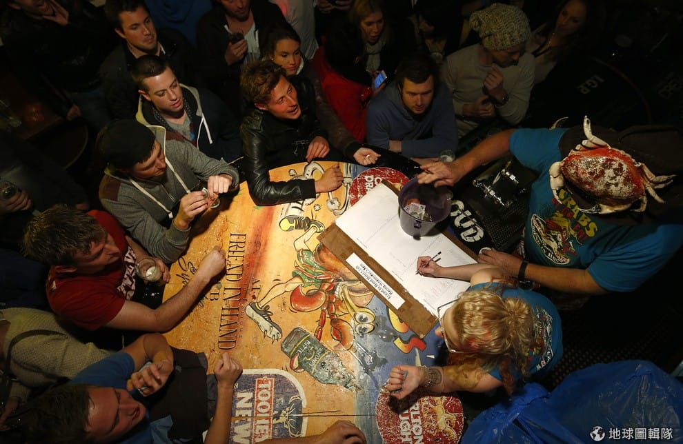 雪梨中部的格里布(Glebe)有間名叫「朋友就在眼前」(Friend In Hand)的酒吧,這間酒吧以及當地其他幾家酒吧都正流行一種賽跑遊戲,但賽跑主角不是馬或是雞狗豬,而是可以把玩在掌心的寄居蟹!照片中的顧客正興奮地看著競賽桌上的大桶子,裡面就裝著當晚的主角──30隻寄居蟹大軍!
