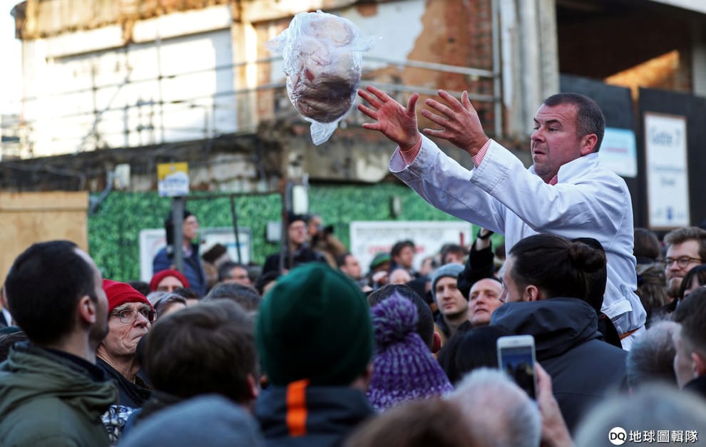 在倫敦史密斯菲爾德市場(Smithfield market),一名屠夫把切好的肉品丟給台下得標的民眾。每年到聖誕夜前夕,史密斯菲爾德市場都會舉行聖誕肉品大拍賣,除了可以讓肉商出清存貨外,也能吸引饕客們前來搶購物超所值的肉品。