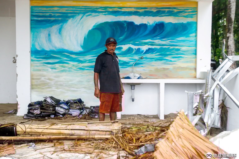 在受到海嘯重創的萬丹省(Banten province)丹絨勒松海灘(Tanjung Lesung),一名員工站在一片狼藉的渡假村酒吧裡,他的身後是一面描繪浪花的壁畫。
