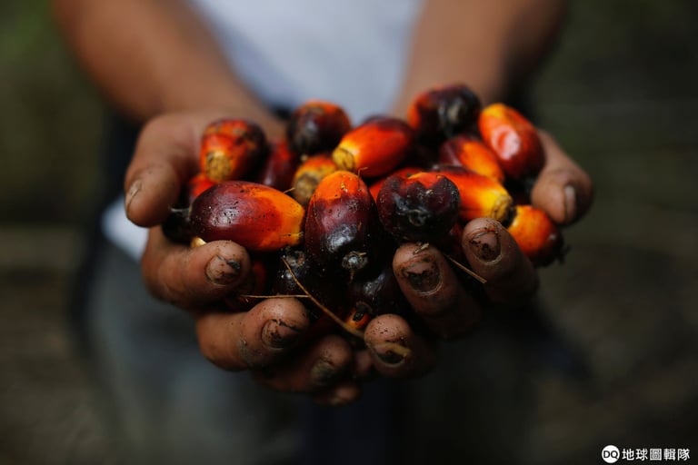 在瓜地馬拉中部的奇塞克鎮(Chisec),農人們在一處棕櫚園內捧起滿手的油棕果實,棕櫚油就是來自這些果實。