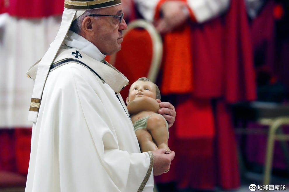 在聖彼得大教堂(St. Peter's Basilica)內,羅馬天主教宗方濟各(Pope Francis)抱著耶穌嬰兒像進行聖誕彌撒。