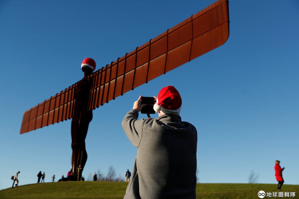 在英國東北部的蓋茨黑德鎮(Gateshead),人們拿起手機拍下戴著聖誕帽的「北方天使」(Angel of the North)鋼鐵雕像,這尊雕像高 20公尺、寬 54公尺,由著名英國雕塑家戈姆利(Antony Gormley)於 1998年完成,是當地的著名地標。