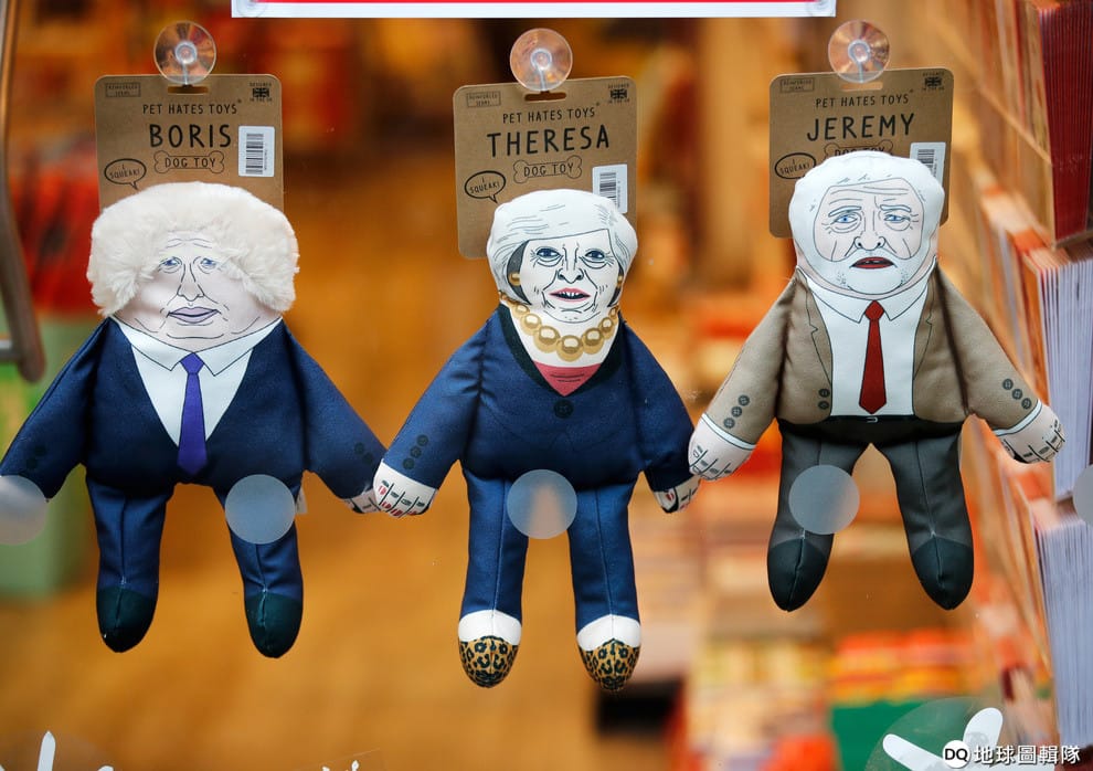 在一間寵物店裡,政治人物版本的寵物玩具被擺在展示架上,從左到右分別是前英國外交大臣強生(Boris Johnson)、英國首相梅伊、工黨領袖柯賓(Jeremy Corbyn)。