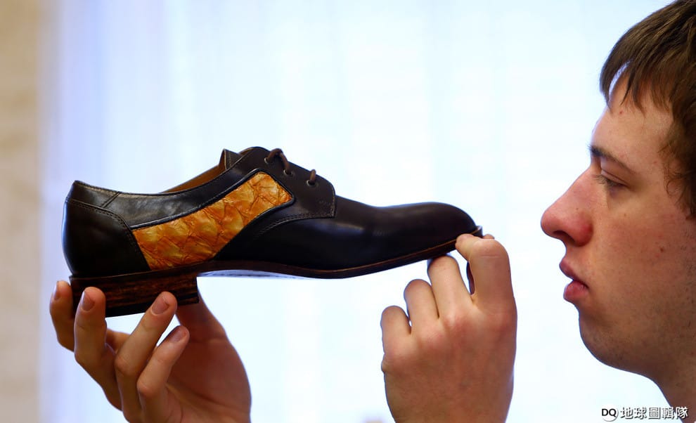 圖為今年 1月,在德國格拉芬(Grafing),第五代鞋匠科佩茨(Michael Koppitz)仔細檢查他剛做好的手工皮鞋,這雙皮鞋是他用鸚哥魚(parrot fish)的「魚革」製成的。
