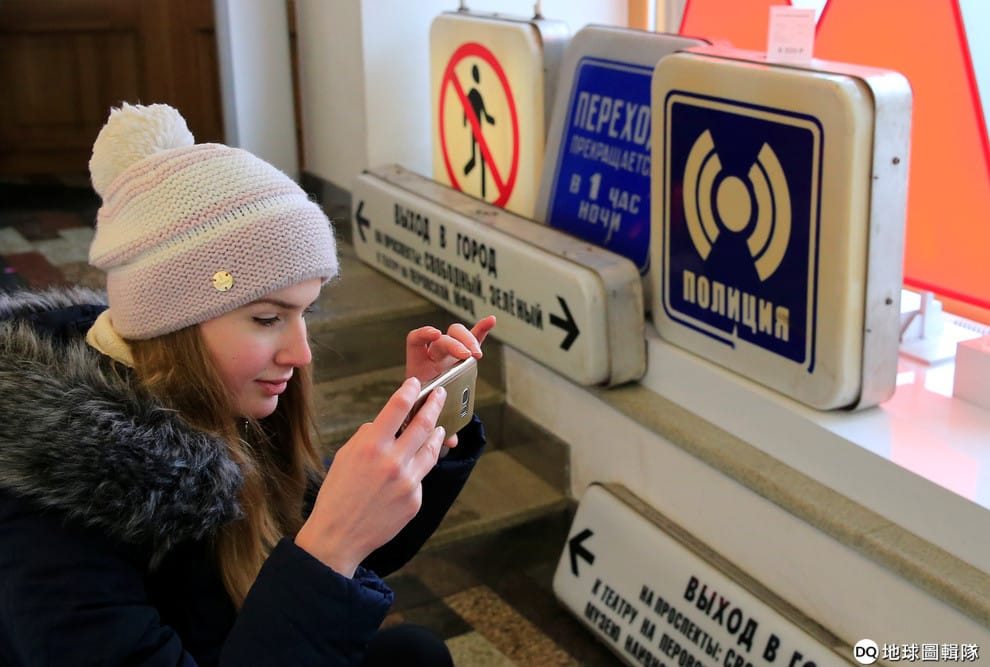 在莫斯科,一名觀光客拿出手機拍下地鐵站內的老告示牌,這些牌子都已經退休,現在開放民眾購買留念。