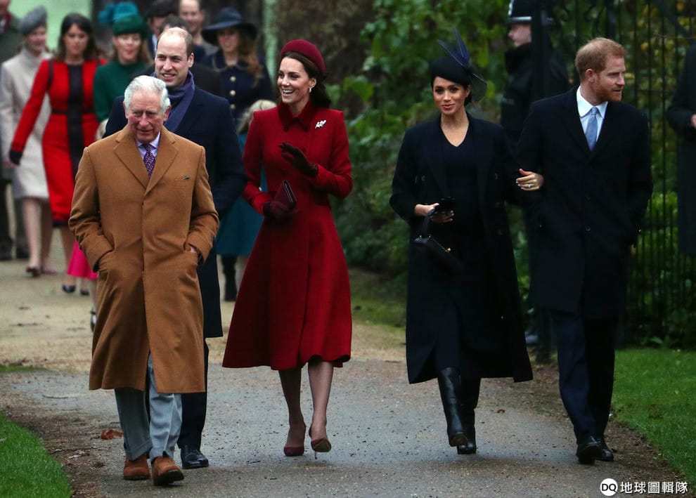 在倫敦東北部的桑德令罕府(Sandringham Estate),英國皇室成員準備一起上教堂慶祝聖誕,由左至右分別是查爾斯王子(Prince Charles)、劍橋公爵夫婦威廉王子(Prince William)、凱特王妃(Catherine Duchess of Cambridge)、薩塞克斯公爵夫人梅根(Meghan, Duchess of Sussex)和哈利王子(Prince Harry)。