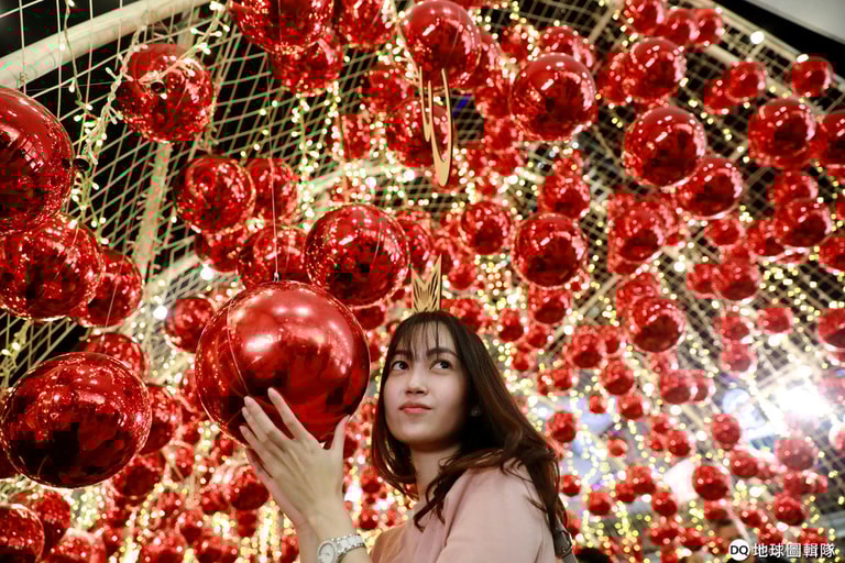 在曼谷,一名女子和聖誕限定的紅球裝飾拍照,享受聖誕佳節溫暖的氣氛。